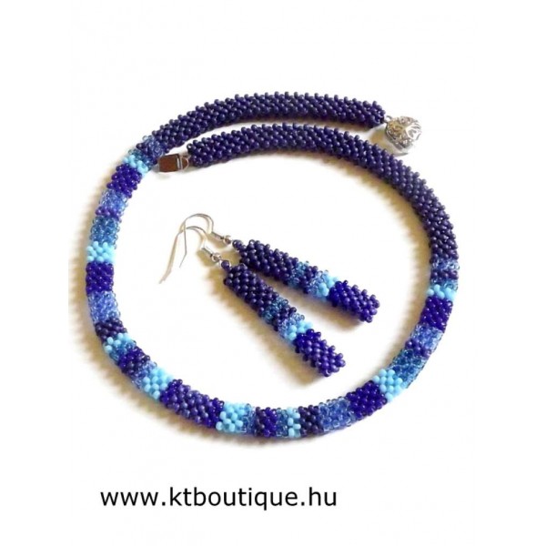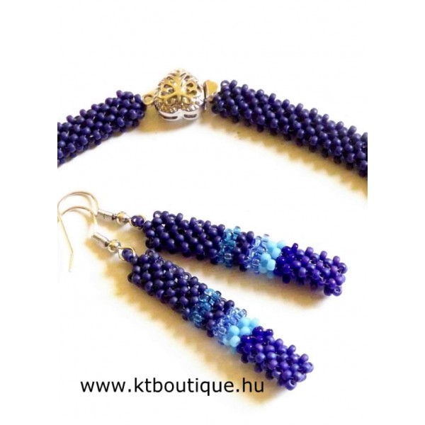 Leírás, megjelenés: aprólékos fűzésmintával, top minőségű japán kásagyöngyből fűzött vastagabb fazonú nyaklánc és vidám, bohókás téglatest forma fülbevaló kettőse. A fülbevaló mérete ellenére pillekönnyű viselet, hosszúkás fazonja optikailag formázza az arcot, igen előnyös minden arcformához. Stílusos, különleges megjelenést biztosító ékszerszett, a nagy kedvec kék árnyalatokban, igazi alapdarab, mely minden minden stílusú ruházathoz kiválóan illik.