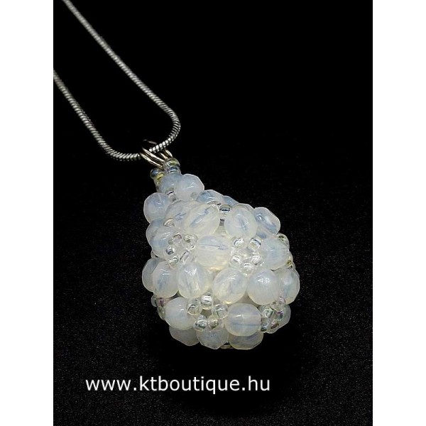 Leírás, megjelenés: térbeli fűzéssel készült a csepp formájú medál, melyet színben hozzáillő viaszosszál lánccal szállítunk. Egyszerű, de mutatós nyaklánc, sokféle színben kapható, vagy rendelhető. Fülbevaló külön kérhető hozzá.