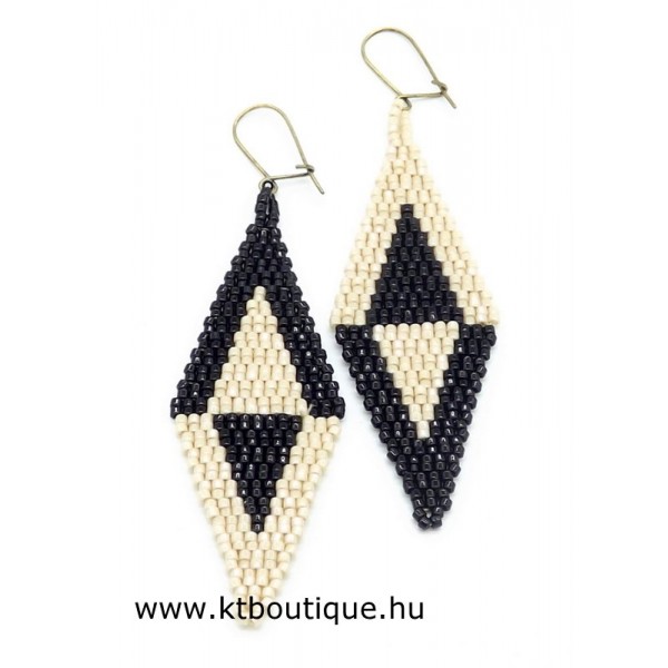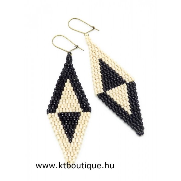 Leírás, megjelenés: geometrikus mintájával modern eleganciát sugároz ez a fekete-bézs rombusz forma fülbevaló. A kontrasztos színpárosítás könnyedén illeszkedik bármilyen ruhatárhoz, így univerzális kiegészítővé válik. Könnyű súlyának köszönhetően egész nap kényelmesen viselhető, mégis látványos. Tökéletes választás azoknak, akik a minimalista stílust kedvelik, nem idegenkednek egy kis asszimetriától és nem szeretnének lemondani a feltűnő részletekről.