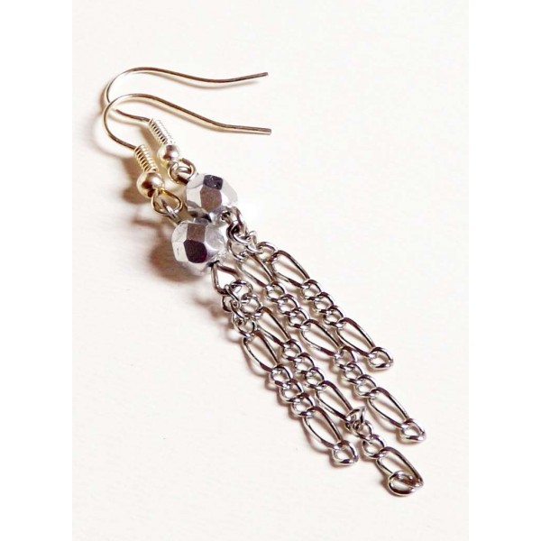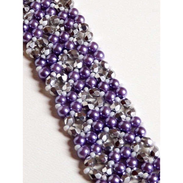 Csillogó ezüst és selymes fényű lila gyöngyökből készült karkötő biztonságos csőkapoccsal. Lapos és nem túl széles fazonja vastagabb csuklóra is ajánlott. Szélessége kb. 3 cm, hossza kb. 18 cm. Készítettem hozzá egy picike, fémláncos fülbevalót, mely természetesen ajándék.