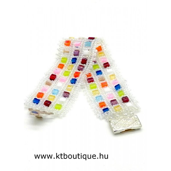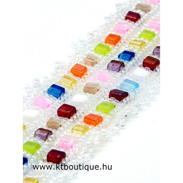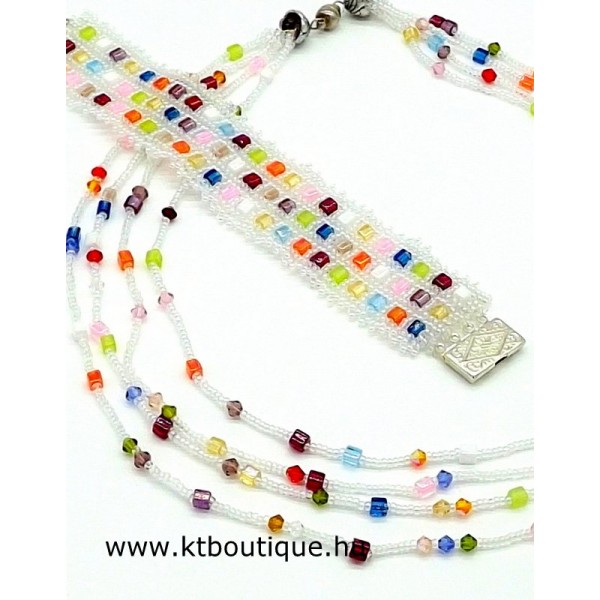 Leírás, megjelenés: Vidám hatású karkötő-nyaklánc szett. A lánc többsoros, a kockagyöngyök között eredeti Swarovski kristályok találhatók, a fényben diszkréten csillannak meg. A többsoros megjelenés a karkötőben is visszaköszön, kockagyöngyök váltakoznak a szivárványos kásagyöngyök között.