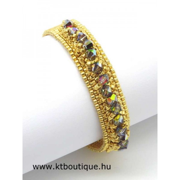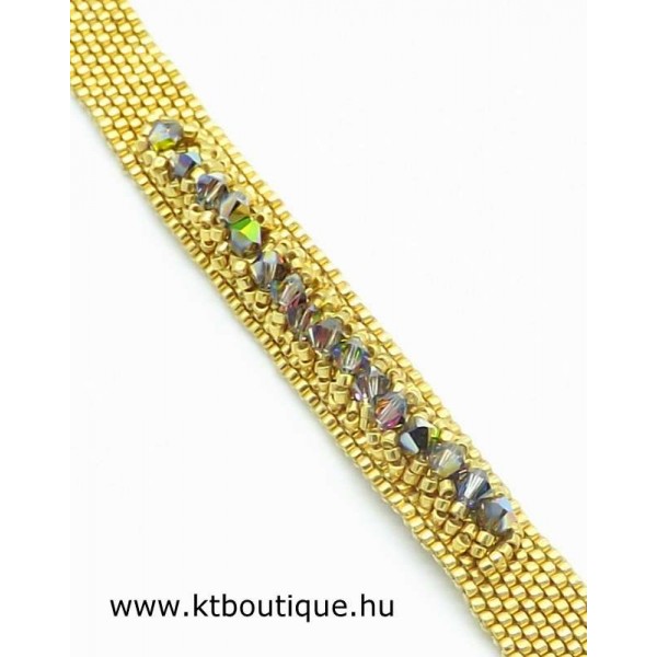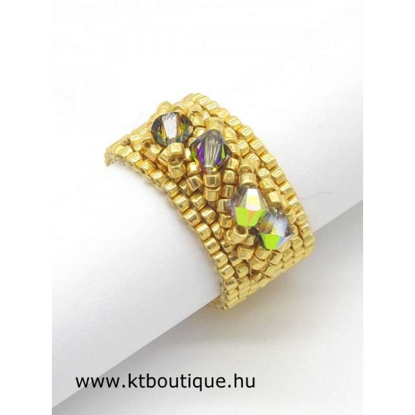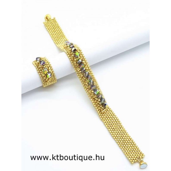 Leírás, megjelenés: egyszerű, de mégis látványos a gyűrű és a hozzáillő karkötő párosa, mert az eredeti Swarovski kristályok minden kézmozdulatra csillognak a fényben és vonzzák a tekintetet. Az egyes darabok alapja fényes tartós bevonatú japán delica gyöngyökből készül, szép egyenletes felületet biztosít a kristály díszítéshez.