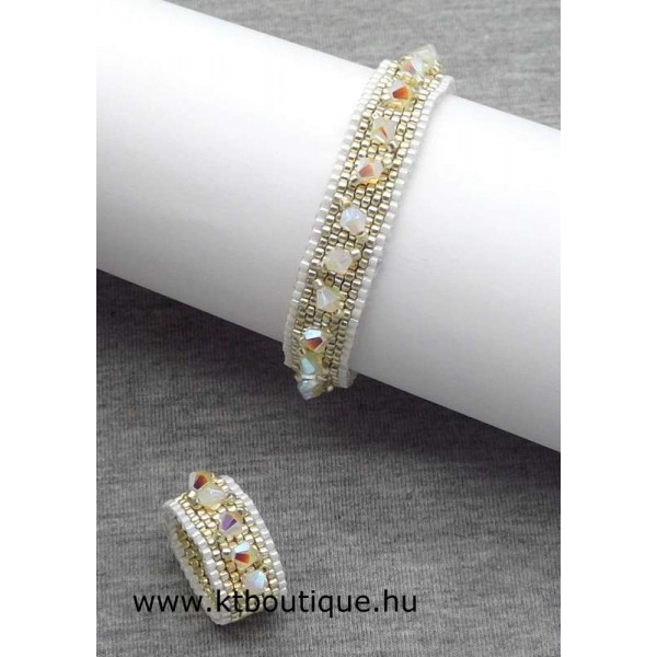 Leírás, megjelenés: egyszerű, de mégis látványos a gyűrű és a hozzáillő karkötő párosa, mert az eredeti Swarovski kristályok minden kézmozdulatra csillognak a fényben és vonzzák a tekintetet. Az egyes darabok alapja fényes tartós bevonatú japán delica gyöngyökből készül, szép egyenletes felületet biztosít a kristály díszítéshez.
