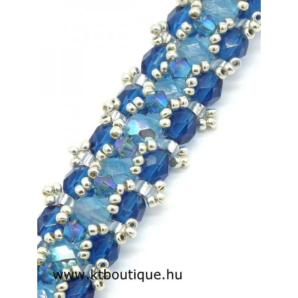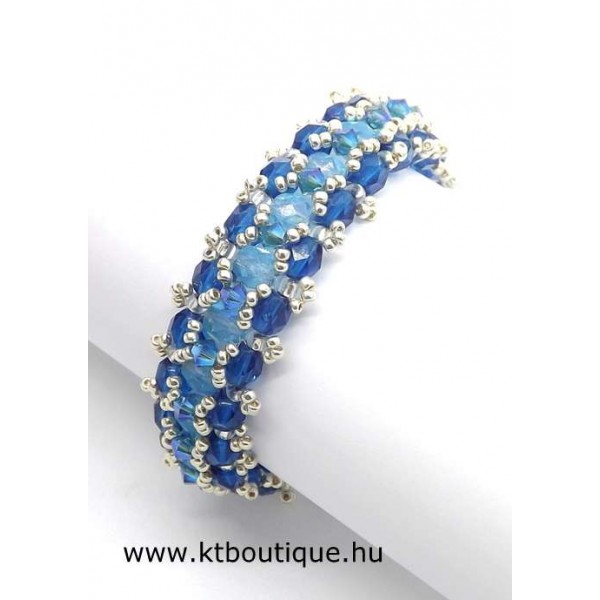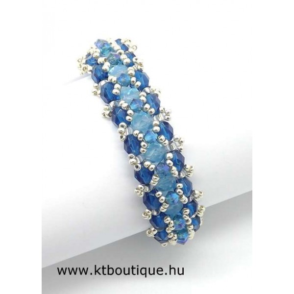Leírás, megjelenés: többféle kék csiszolt gyöngyből fűzött karkötő eredeti Swarovski kristályokkal. A különleges bevonatú kristályok gyönyörűen csillognak minden egyes apró mozdulatra. Az apró gyöngyök csúcsminőségű japán kásák, a tartós bevonatnak köszönhetően nem kopnak, nem feketednek. Az ékszer szélessége közepes, minden csuklóméretre ideális.