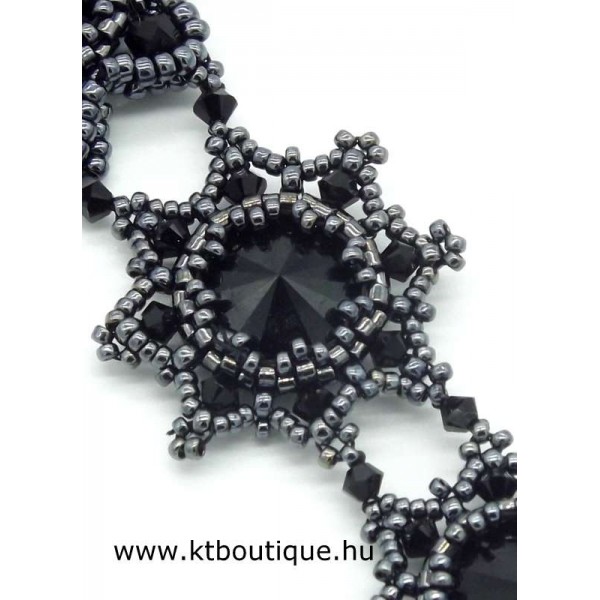 Leírás, megjelenés: Csillagként fénylenek a csodás Swarovski rivolik és gyöngyök ezen a nyakláncon és karkötőn. A szett eleganciáját az aprólékos munkával fűzött csillag formájú elemek és a csavart láncrész is növeli. Finom, nőies darab.