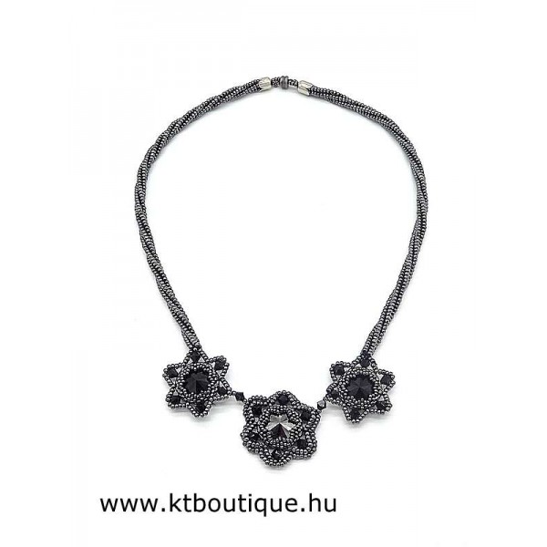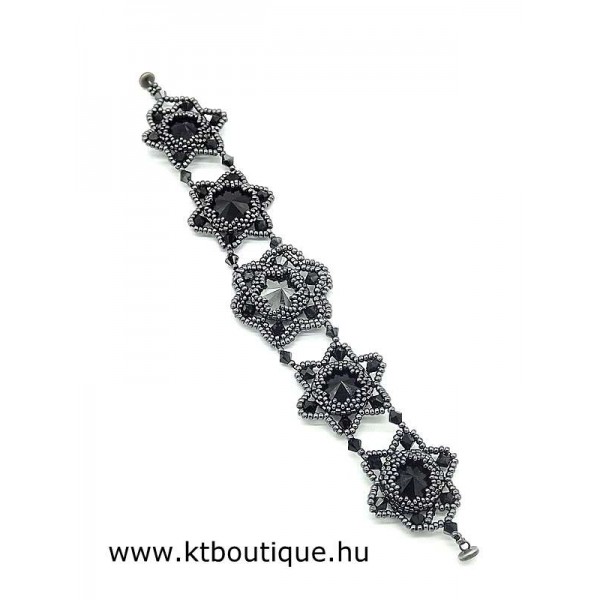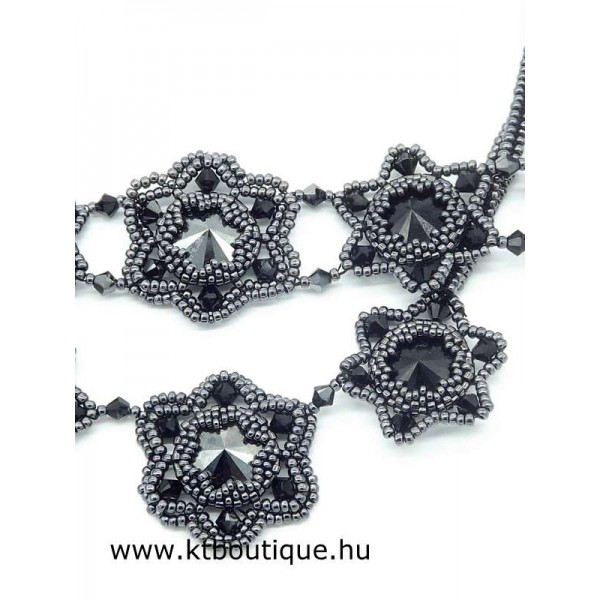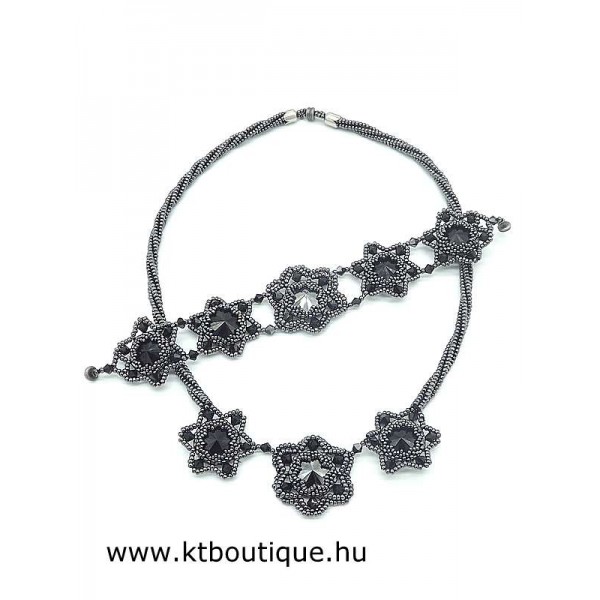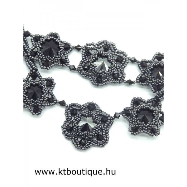 Leírás, megjelenés: Csillagként fénylenek a csodás Swarovski rivolik és gyöngyök ezen a nyakláncon és karkötőn. A szett eleganciáját az aprólékos munkával fűzött csillag formájú elemek és a csavart láncrész is növeli. Finom, nőies darab.
