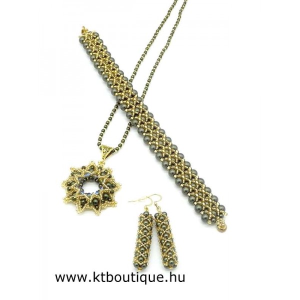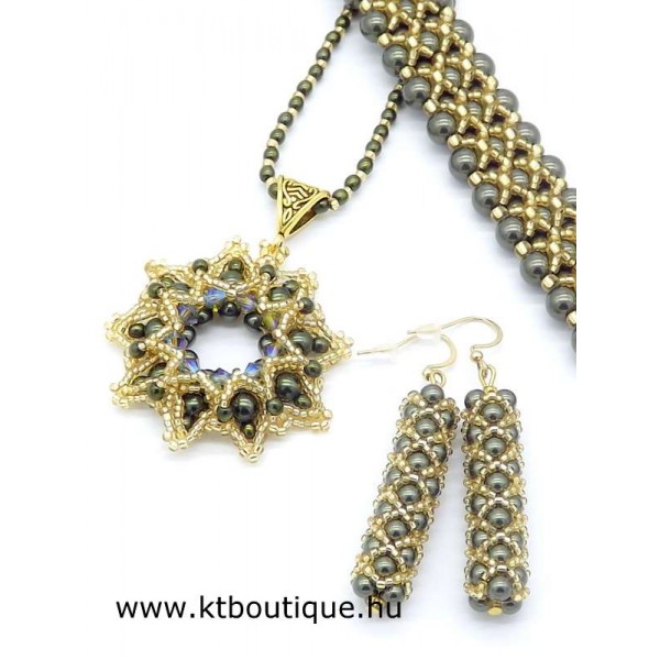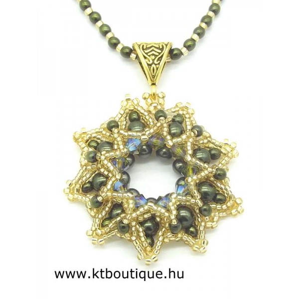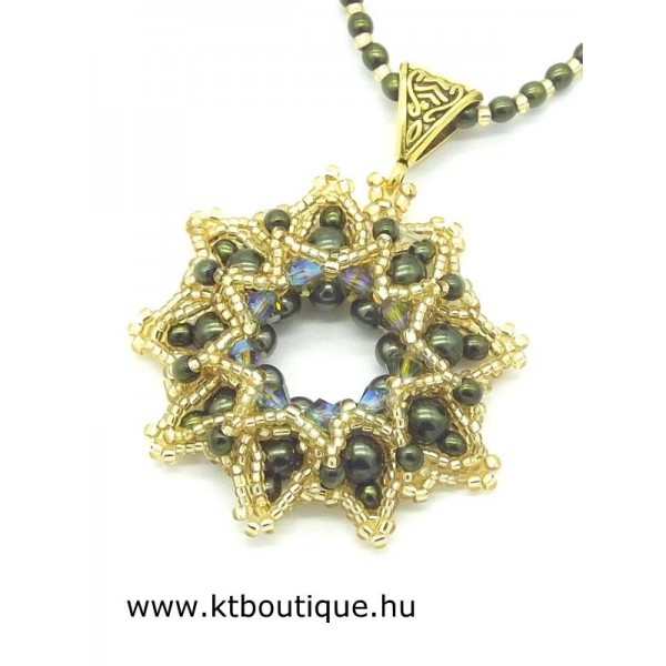 Leírás, megjelenés: gyönyörű csipkés hatású medál, mely csillogó arany és bársonyos sötétzöld színekben pompázik. A selyemfényű teklagyöngyök és a fémes hatású kásák igen plasztikussá teszik az összképet. A közepét speciális bevonatú eredeti Swarovski kristályok hangsúlyozzák ki. A medált elegáns, teklagyönggyel díszített lánc egészíti ki.Az ár a nyakláncra vonatkozik.