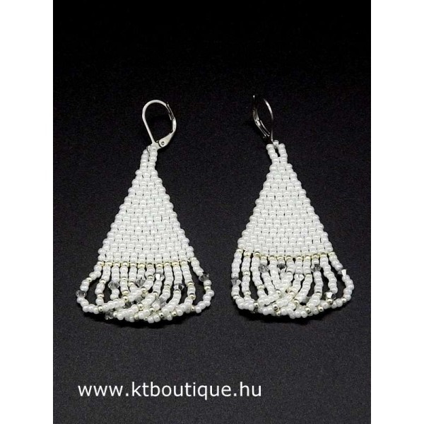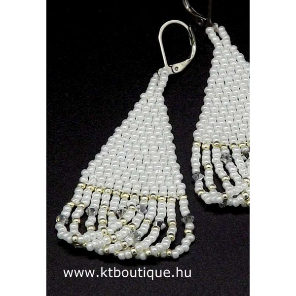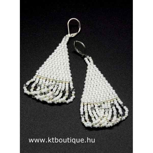 Leírás, megjelenés: Ideális a színe, mert a fehér az ezüsttel minden ruhához illik. Ideális a formája, mert a hosszú fazon szépen nyújtja az arcot, minden arcformához jól áll. És ideális a mérete is,mert ez még a nem túlzottan nagy, de mutatós kategória. És azért is ideális, mert a rojtok között apró Swarovski kristályok vannak, melyek minden mozdulatra megcsillannak és ragyogóvá teszik az arcot.