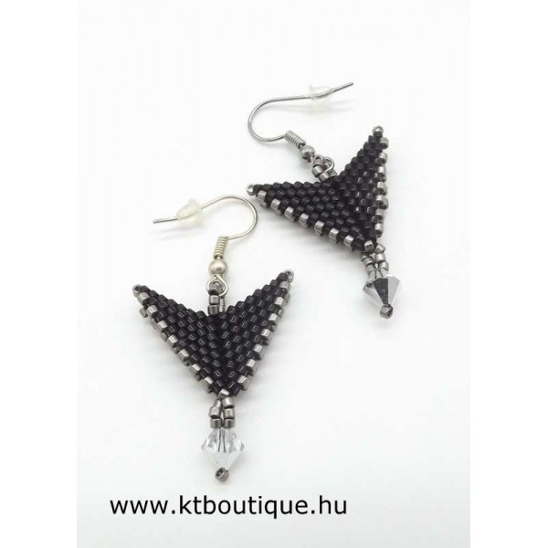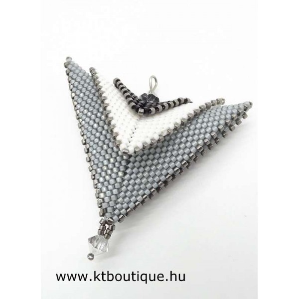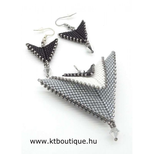 Leírás, megjelenés: rendkívül különleges formájú és kialakítású medál és fülbevaló alkotta szett. A fűzéstechnikának köszönhetően 3D hatású mindegyik elem. A medálhoz lánc kérhető, de saját láncon is jól mutat. Az elemek alját 1-1 nagyméretű eredeti Swarovski gyöngy díszíti. A semleges színek jól illeszkednek minden ruhatárba.