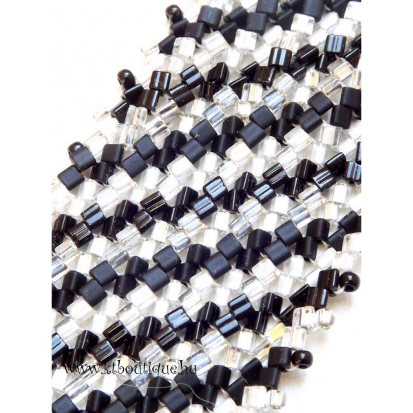 Leírás, megjelenés: Fekete és fehér - az örök páros. Ám hogy ne legyen olyan egyszerű, kétféle fehér és kétféle fekete háromszög gyöngy váltakozik diagolás csíkosan a modellen. Ha akarod hétköznapi, ha akarod elegáns. A közepesen széles, lapos minta erősebb csuklón is szépen mutat.